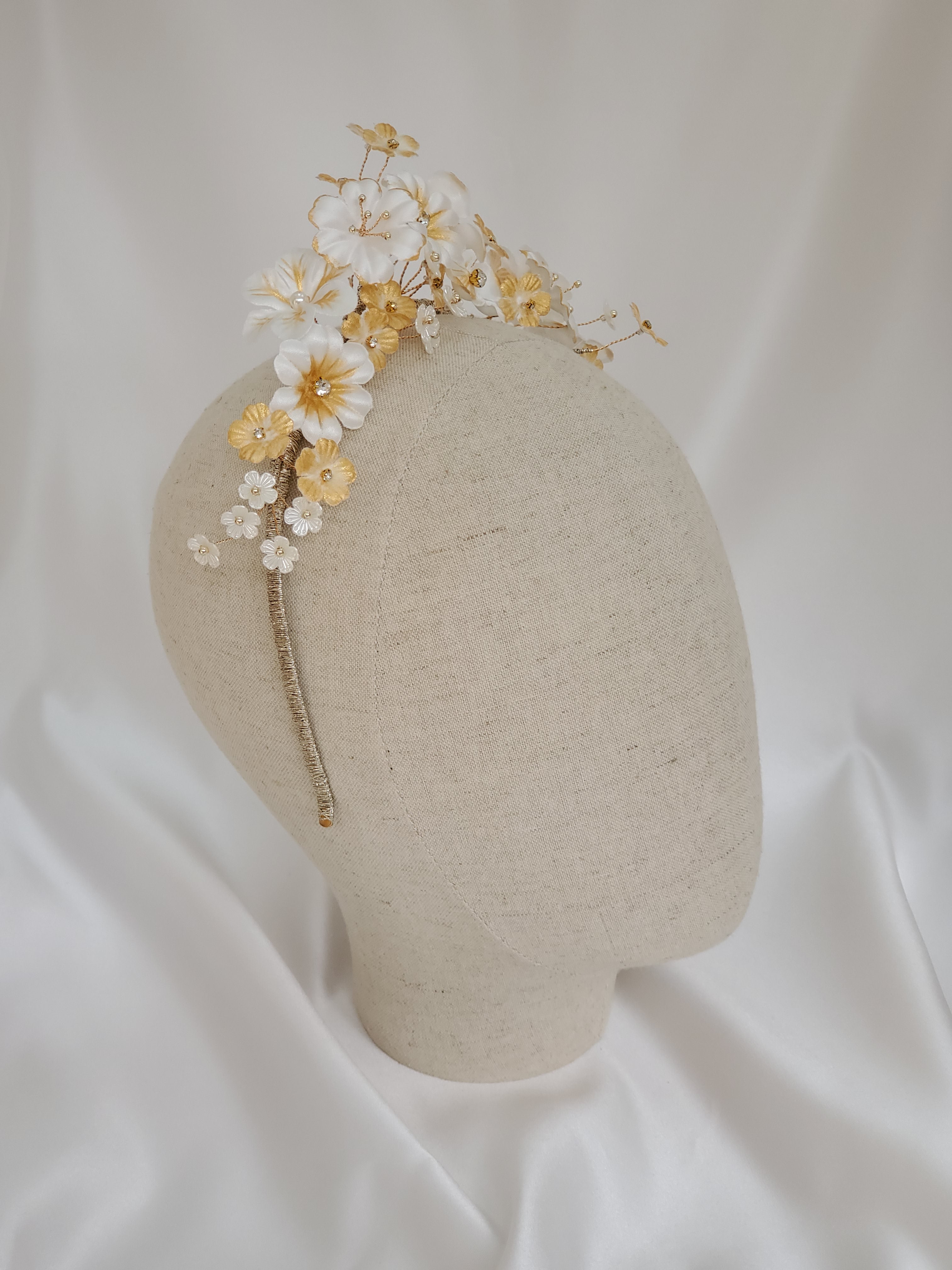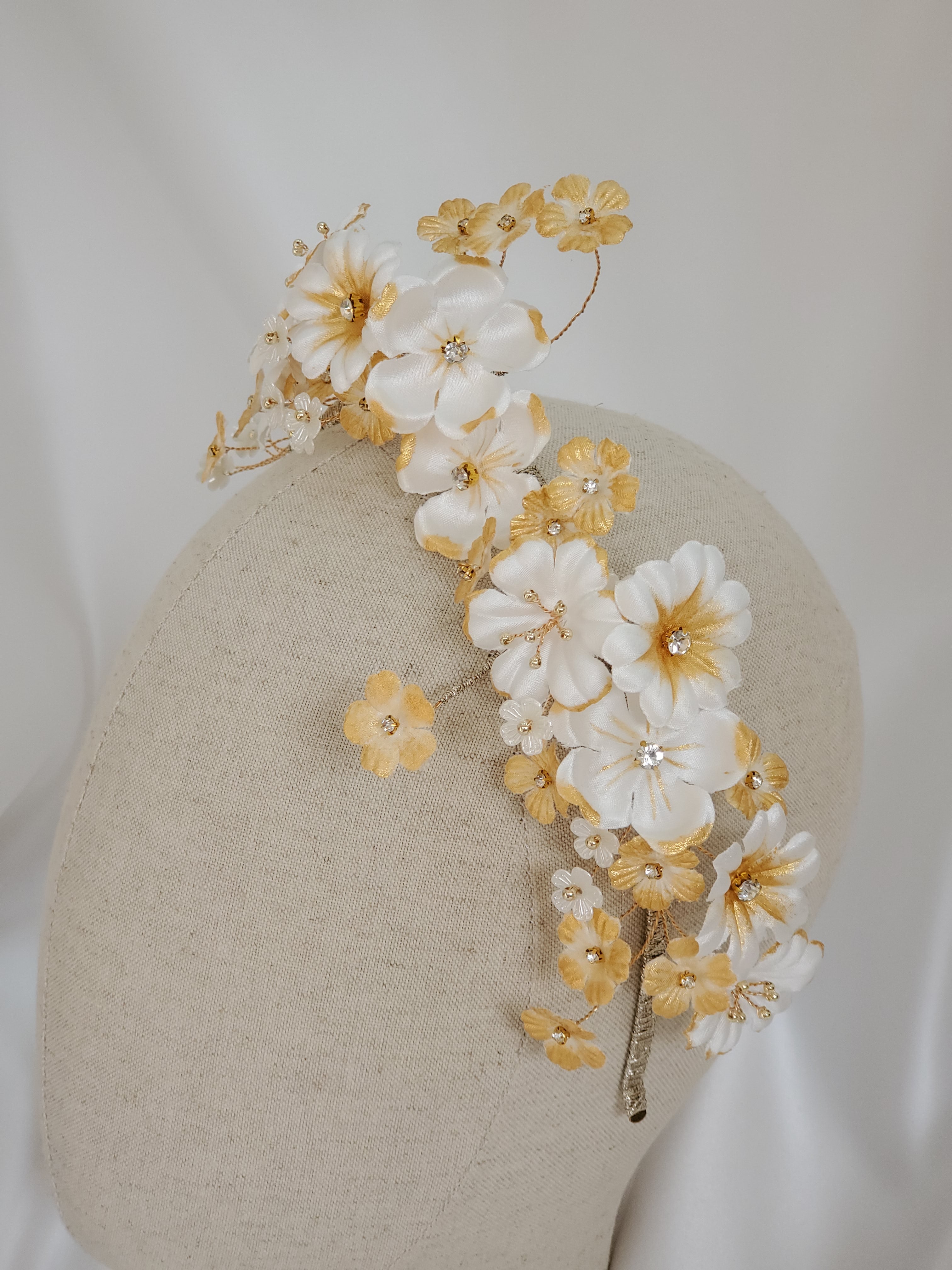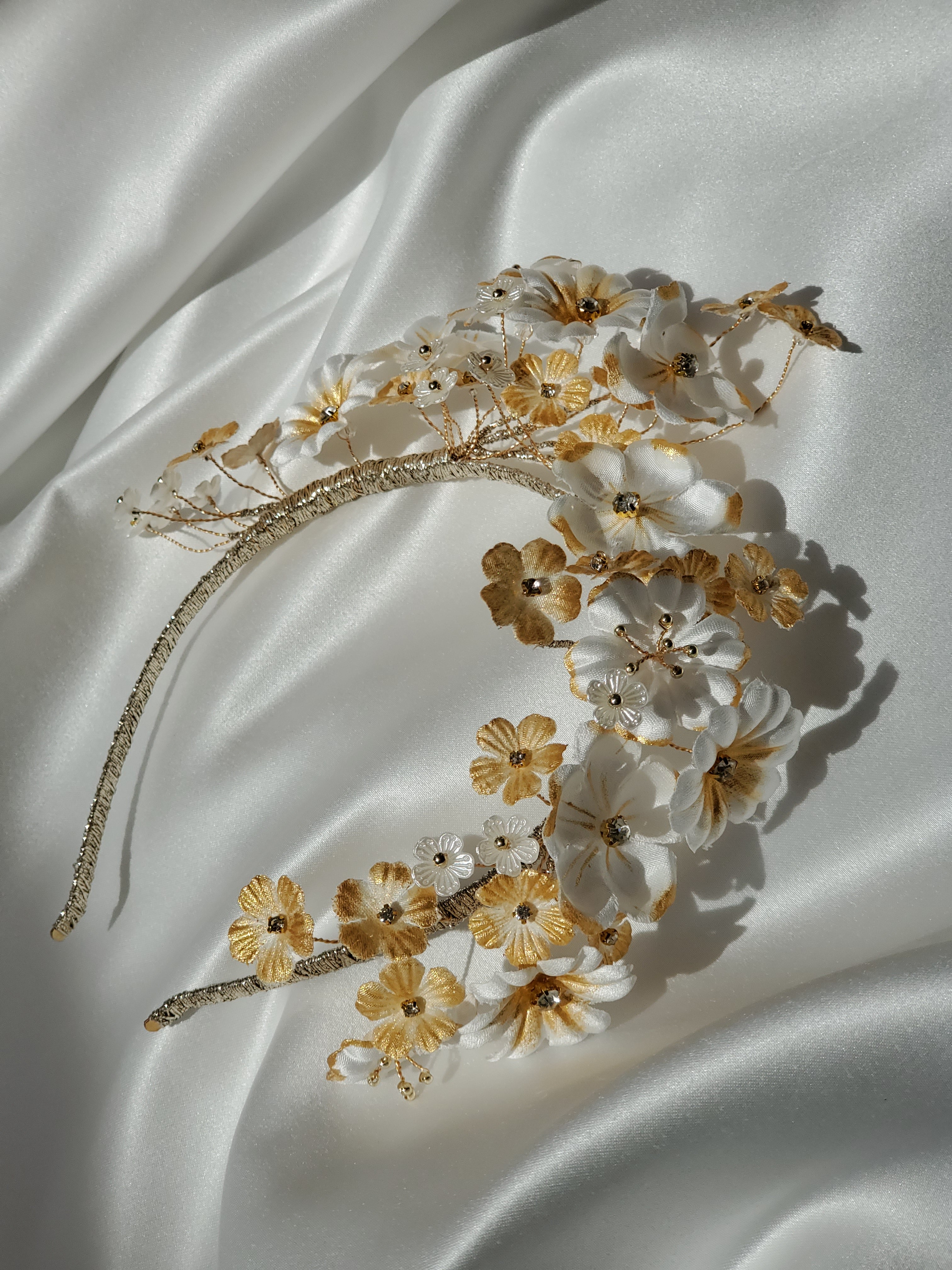 Make a truly glamorous statement with this luxurious, handcrafted headpiece. An organic arrangement of soft, fabric petals, each hand-painted with a rich, metallic gold sheen, creates a breathtakingly modern and elegant silhouette. The petals are artistically placed to cascade across the top and side of the head, catching the light and adding a radiant glow to your face. This versatile piece pairs beautifully with any gown, from a sleek, minimalist design to a lavish, textured masterpiece, ensuring you shine with sophisticated style at any special event.