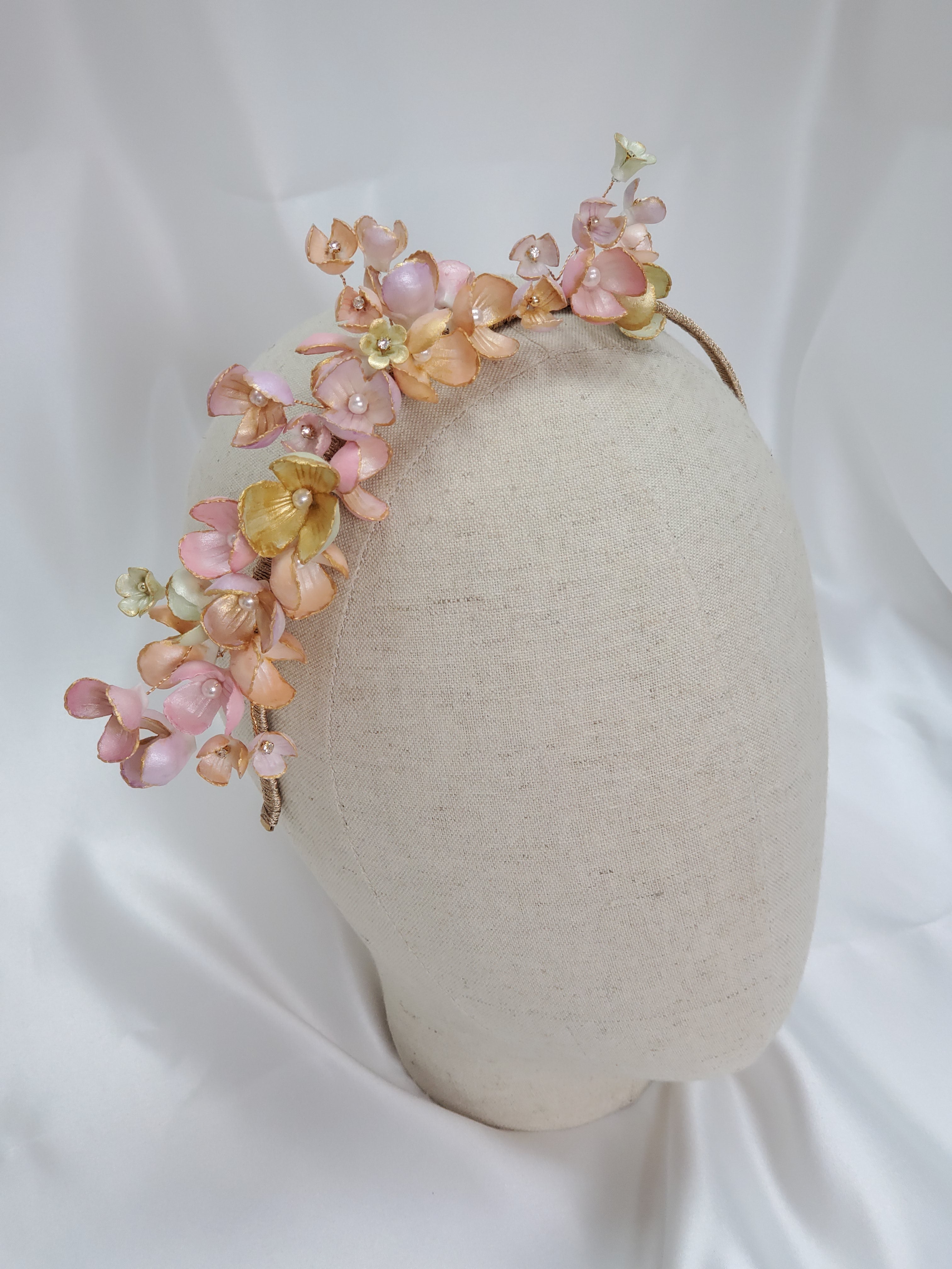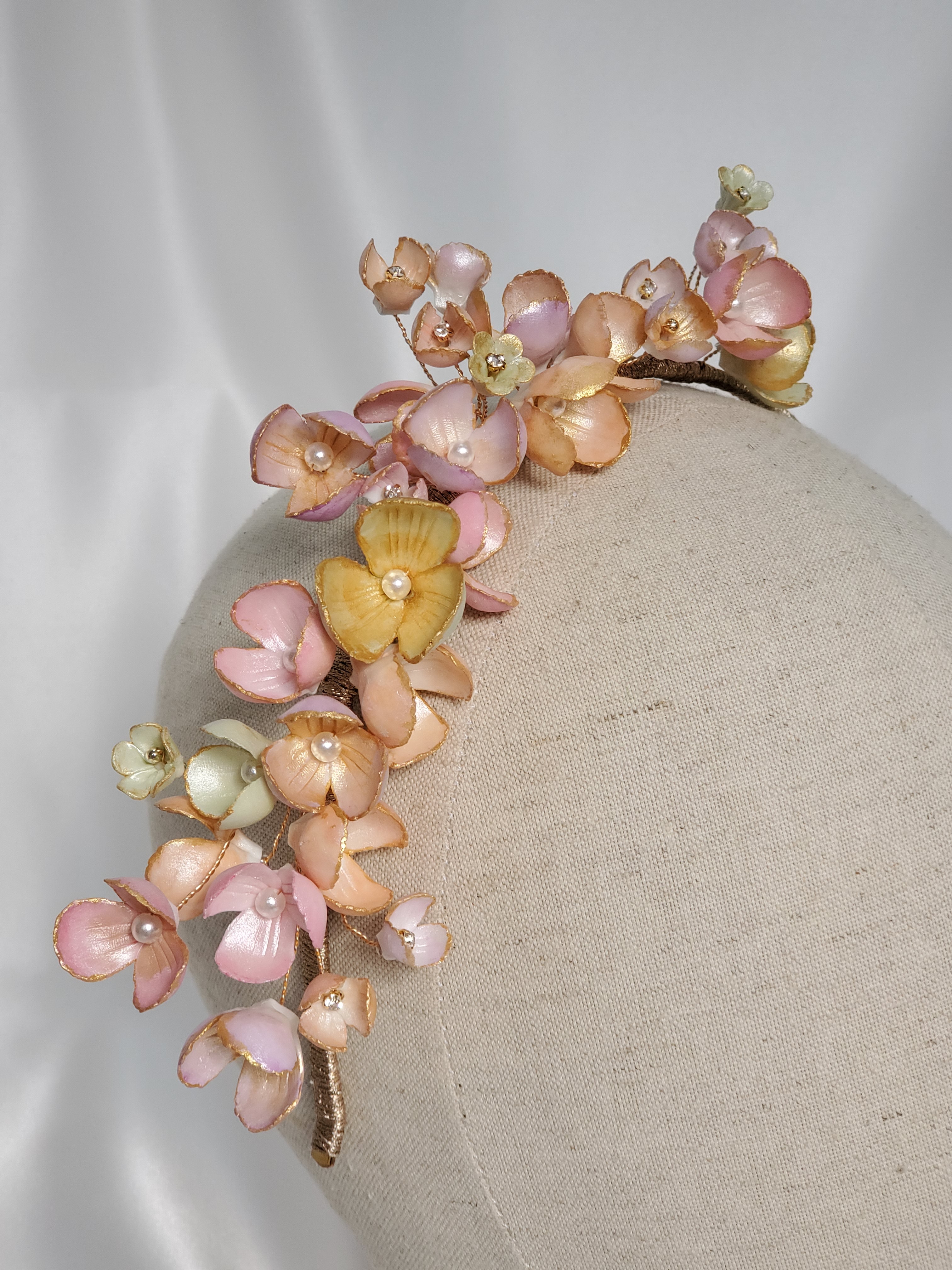 Evoke the soft, romantic charm of an enchanted garden with this handcrafted floral headpiece. Delicate tulip shaped clay flowers are meticulously hand-painted in a palette of gentle pastel colours, with each petal kissed by a touch of shimmering gold. Cascading ivory pearls, sparkling rhinestones, and radiant gold beads are woven throughout, adding a breathtaking layer of luminescence. The Blossom Medley crown is a perfect finishing touch for a bride seeking a fairy-tale look, or for any momentous event that calls for a touch of refined, botanical beauty.