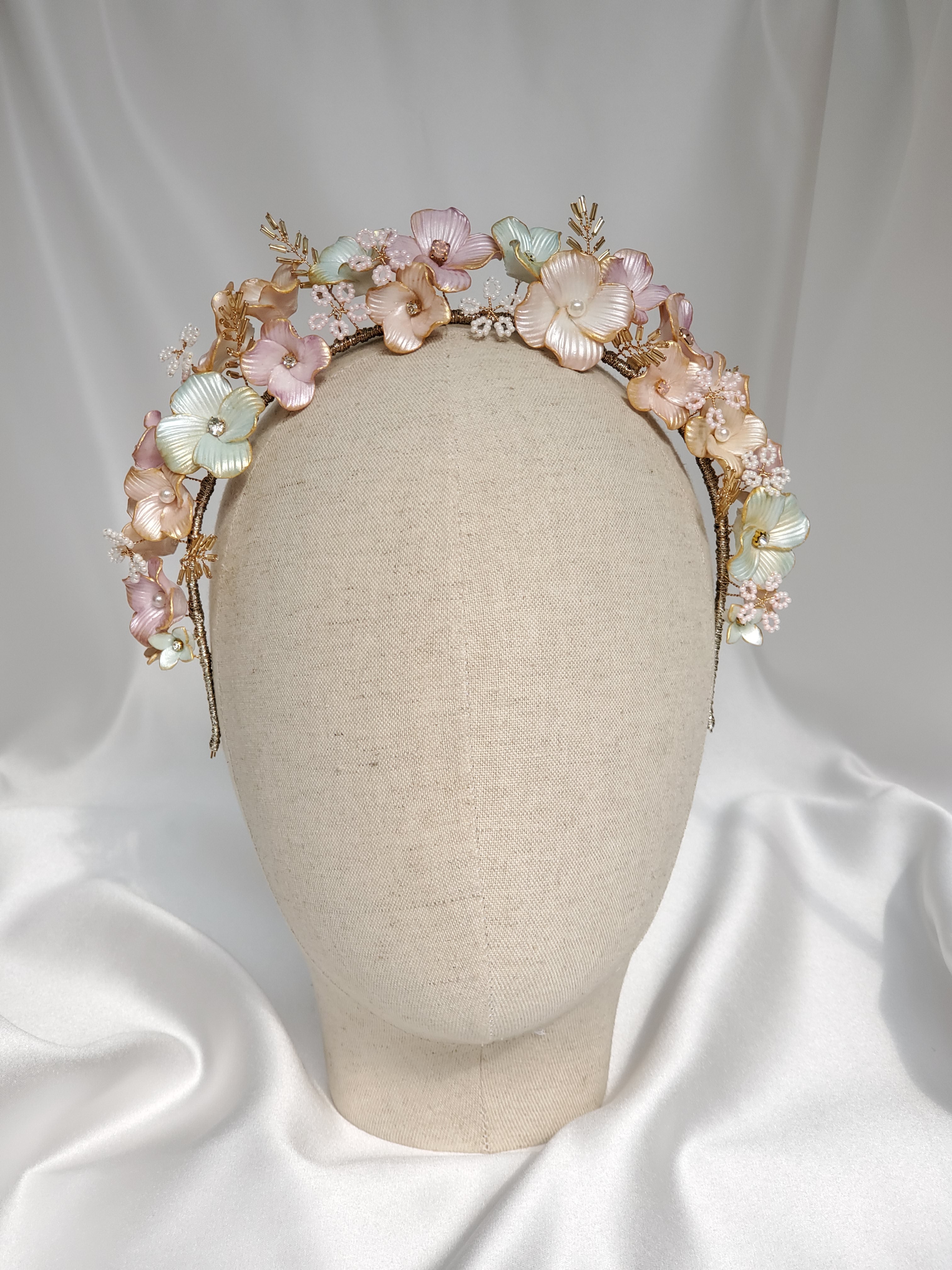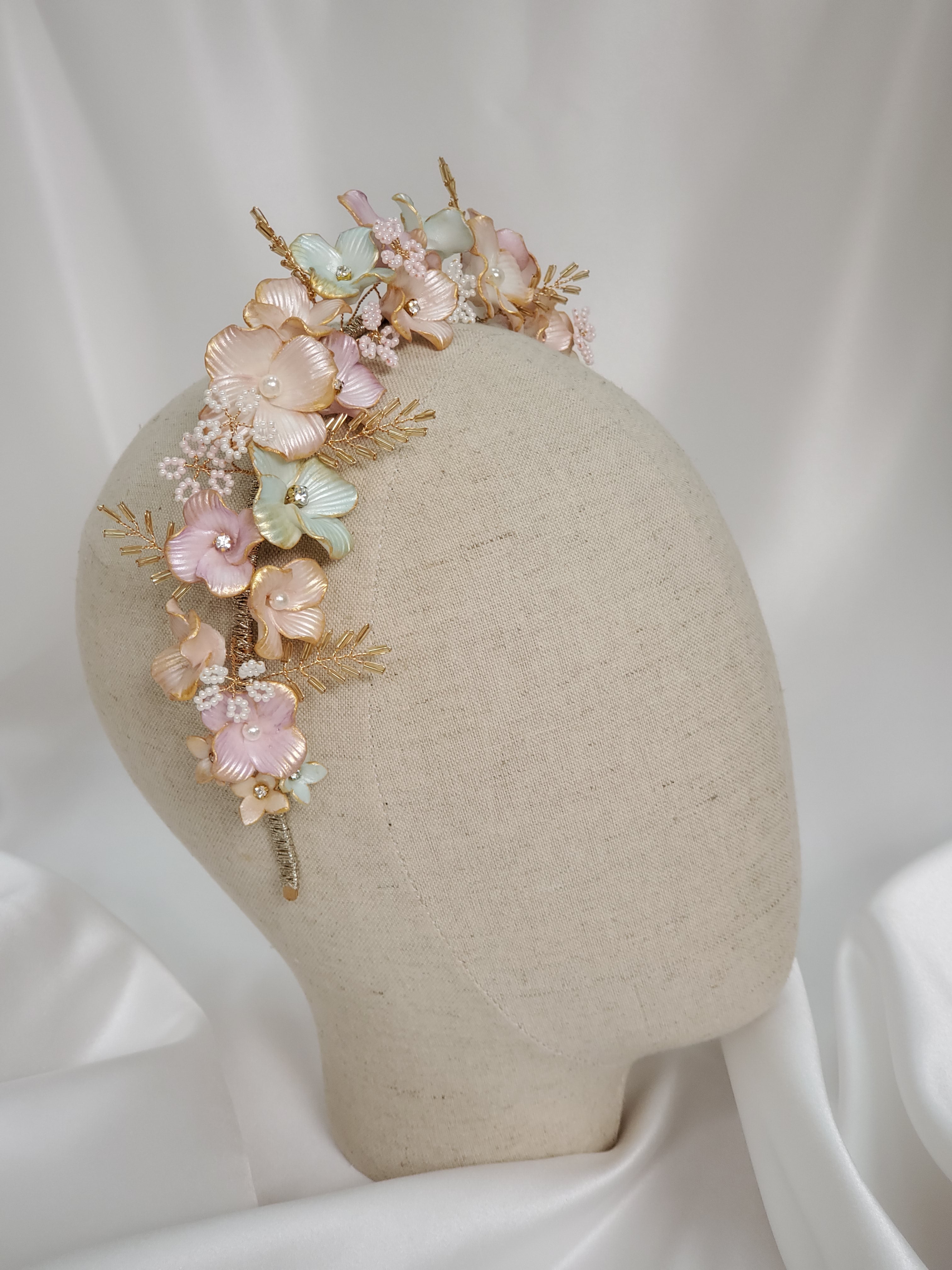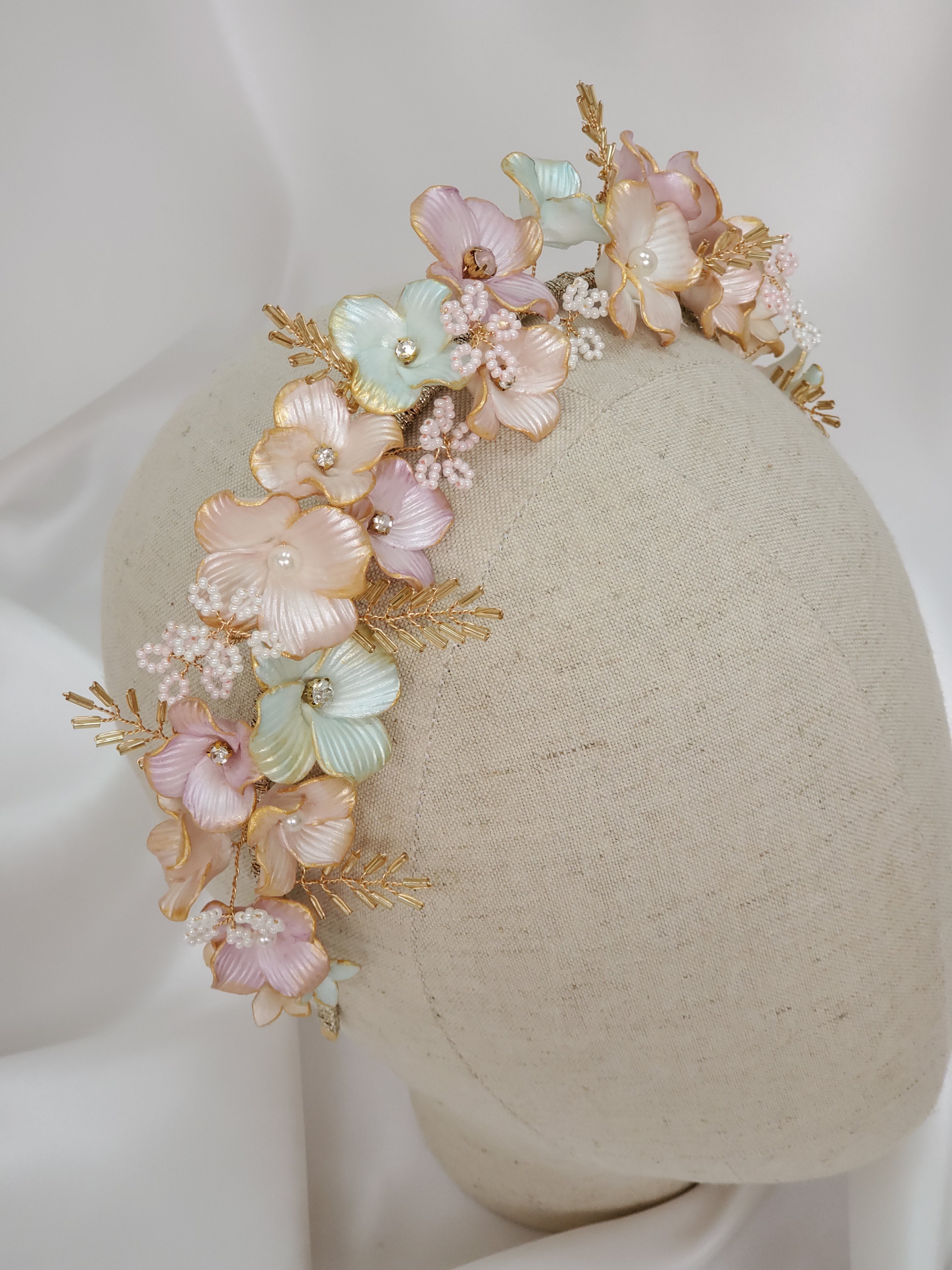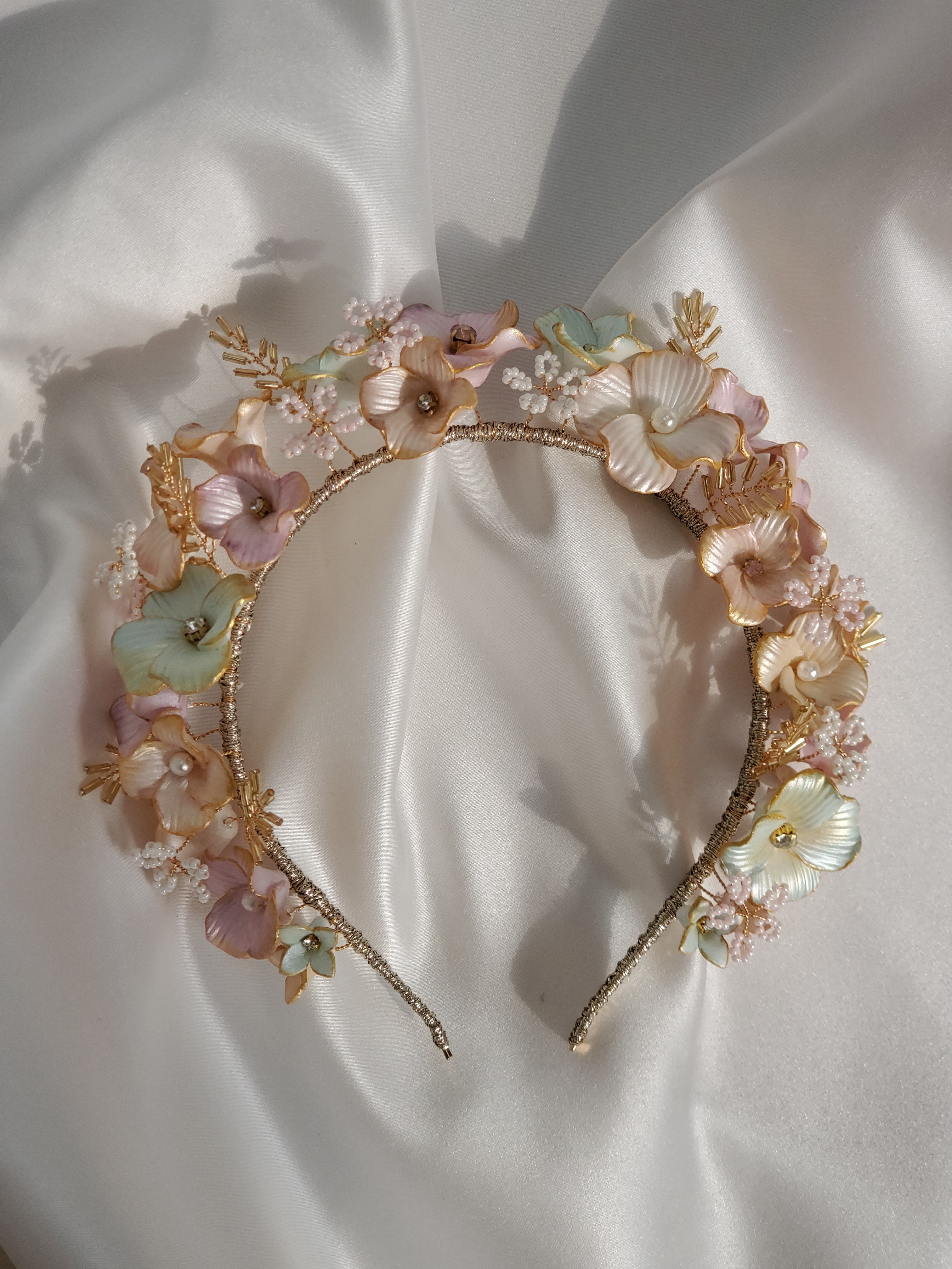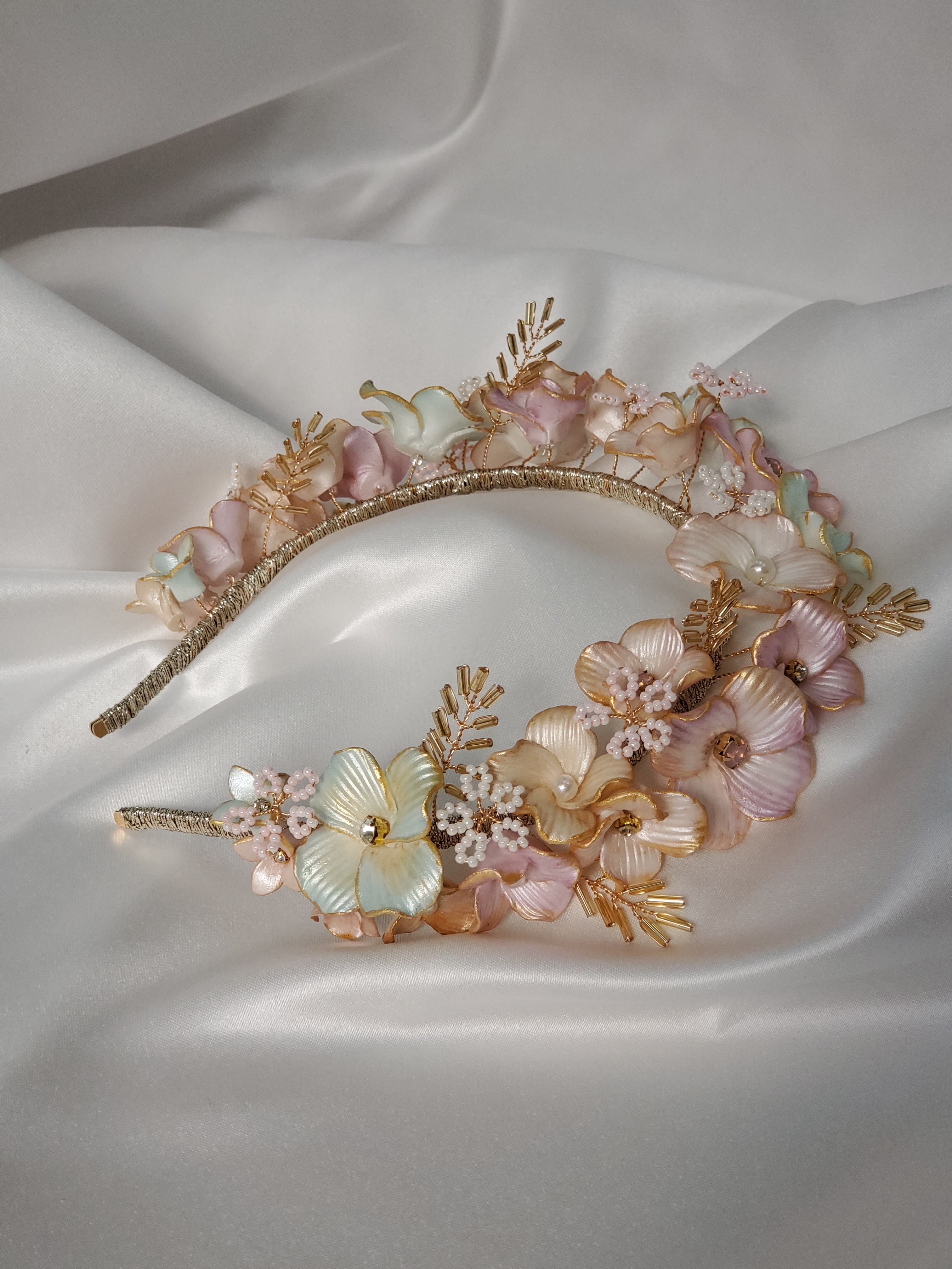 Step into a fairytale with the Enchanted Garden Crown, a luxurious interpretation of a magical spring garden. A cascade of delicate clay flowers blooms across the band, each petal hand-painted in soft pastels of pink, lilac, cashmere, and aqua, with a touch of shimmering gold. The garden comes alive with sparkling rhinestones and lustrous ivory pearls, which mingle with intricate, hand-beaded French wire blossoms shaped like daisies. Golden tube beads serve as glimmering leaves, completing this romantic floral masterpiece. It's a crown for the bride who dreams of a colourful, magical day.