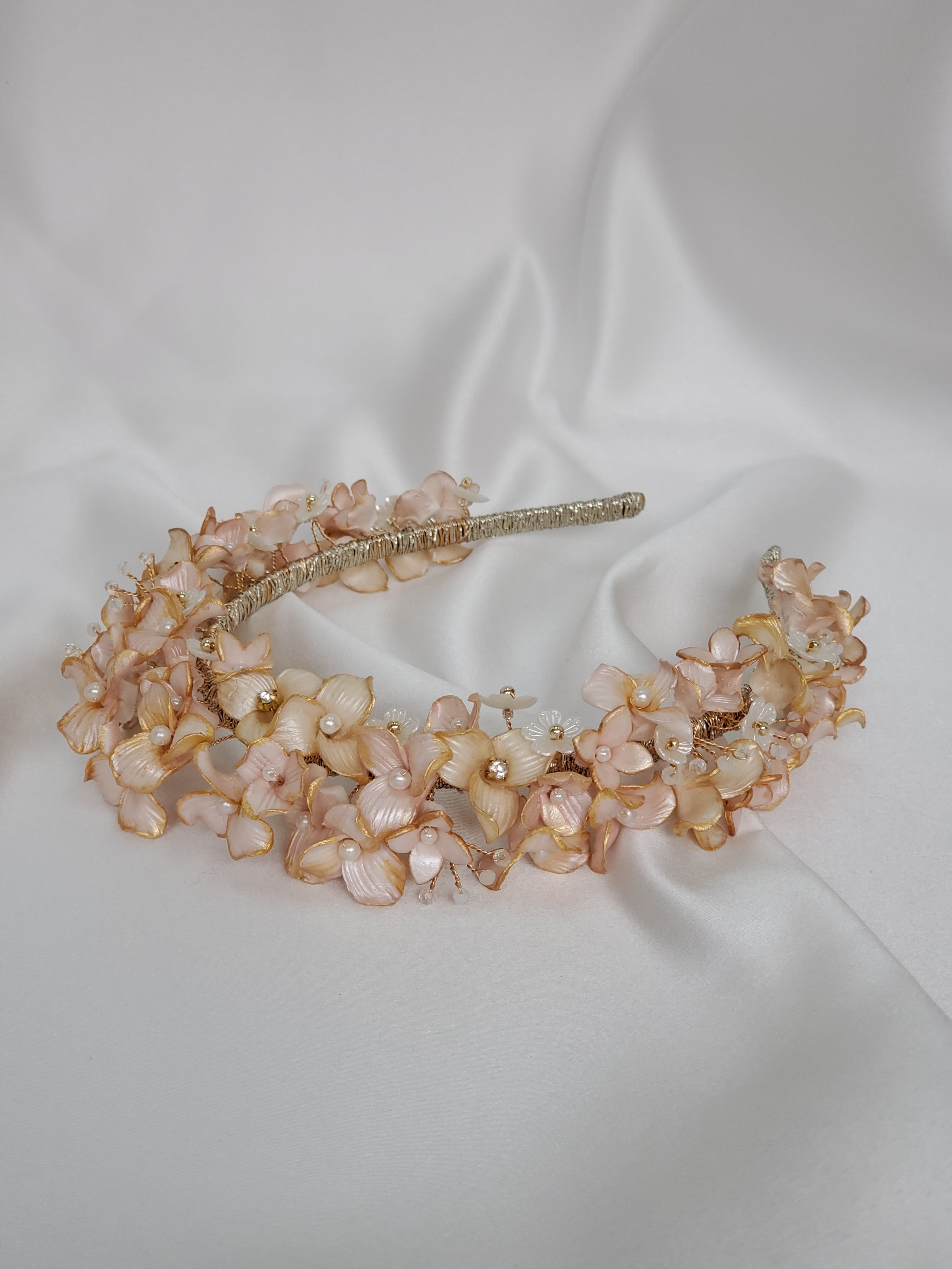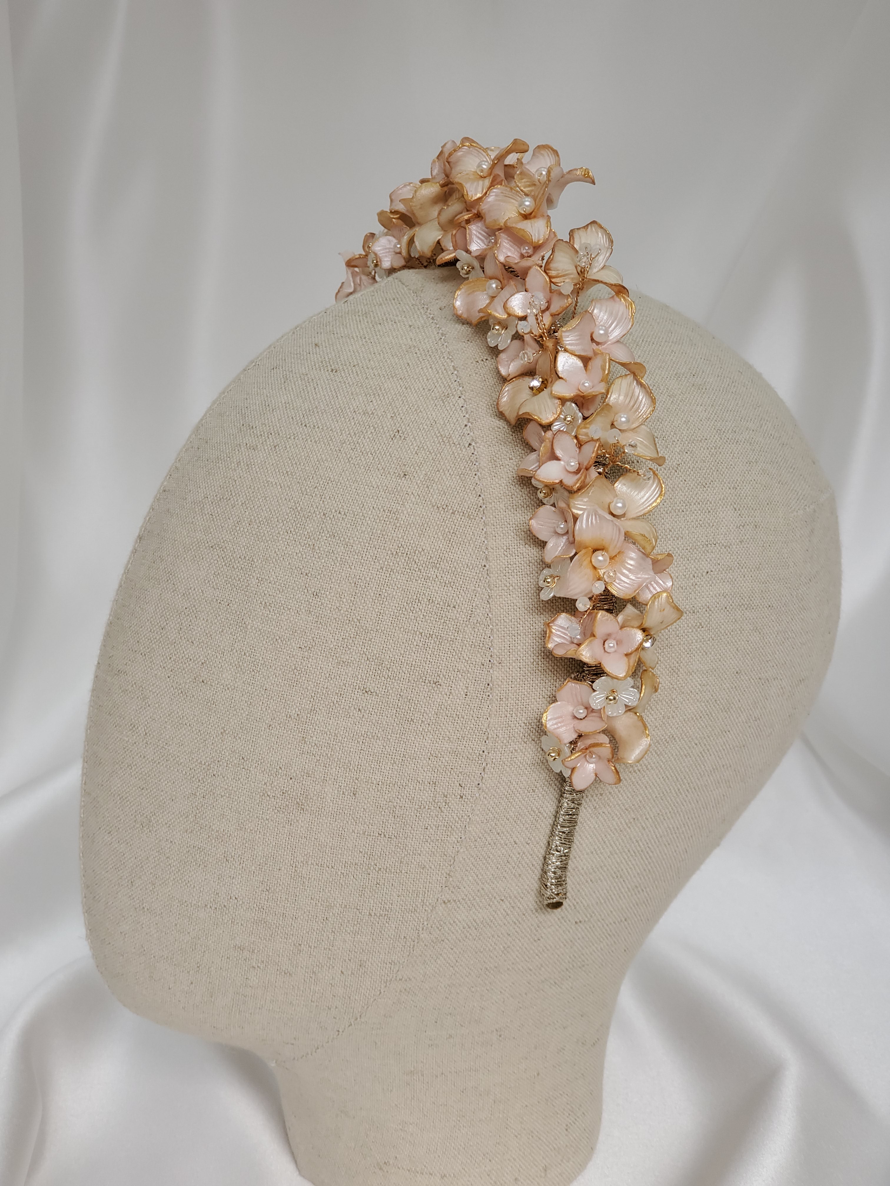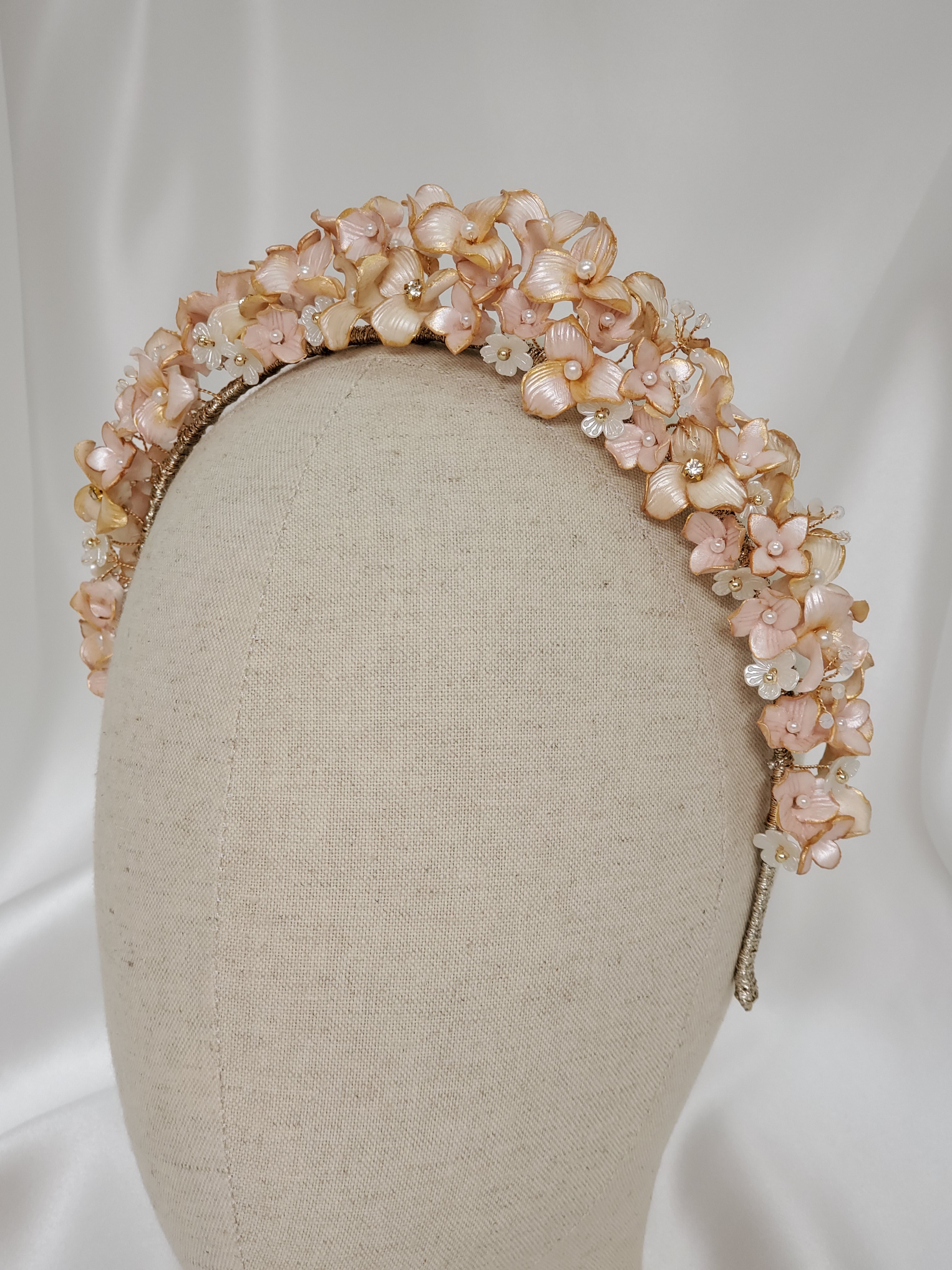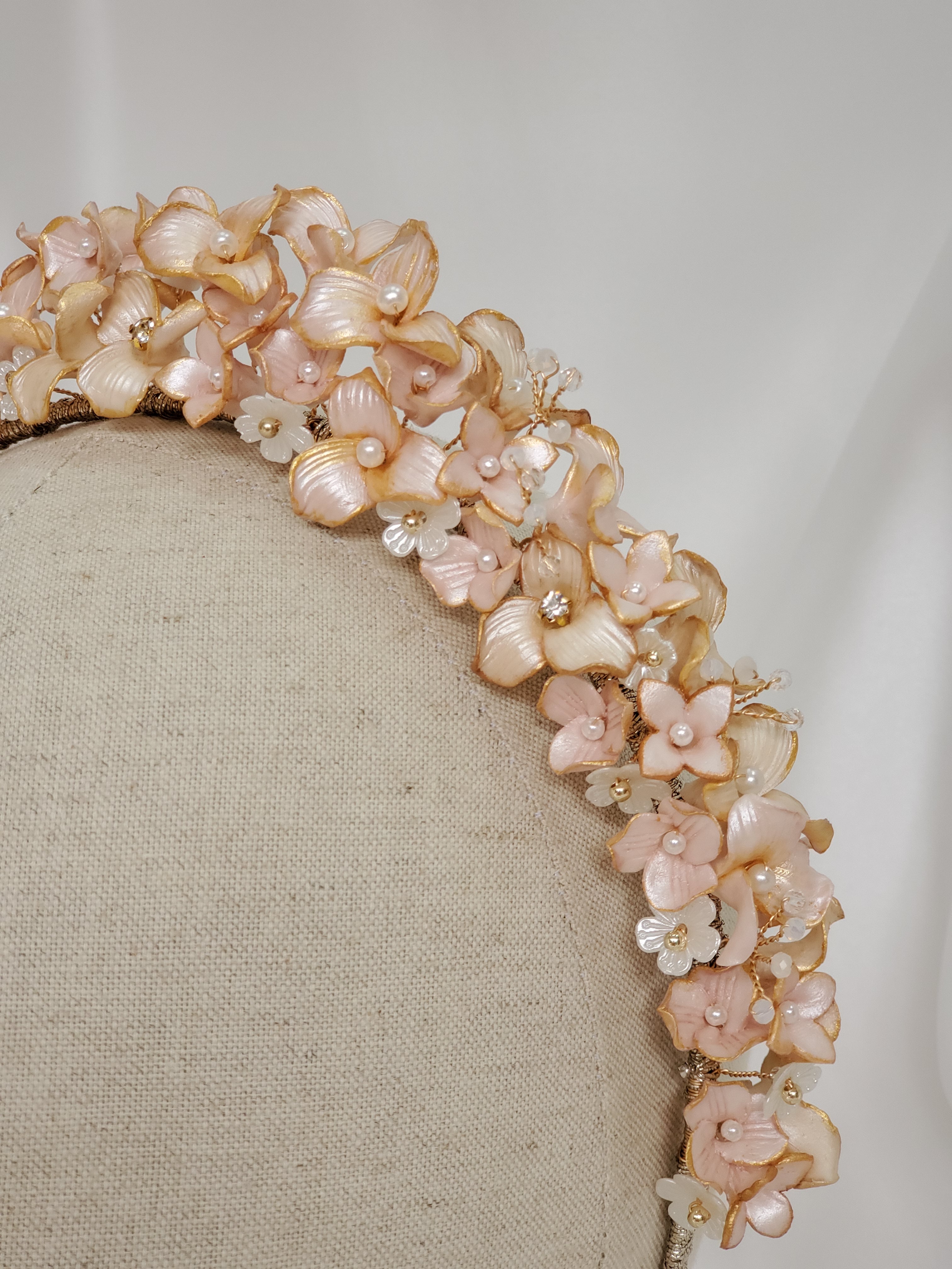 Elevate your style with a piece of wearable art. This luxurious headpiece showcases an abundance of over 60 handcrafted, lily-shaped clay flowers. The artisanal quality is evident in the unique detail of each petal, individually painted with a sheer, blushing iridescence and hand-finished with delicate strokes of gold. A constellation of ivory pearls, glimmering rhinestones, and radiant gold beads is interwoven into the design, creating a rich texture and breathtaking sparkle. This is more than just an accessory—it's a meticulously crafted piece designed to make a magnificent statement.