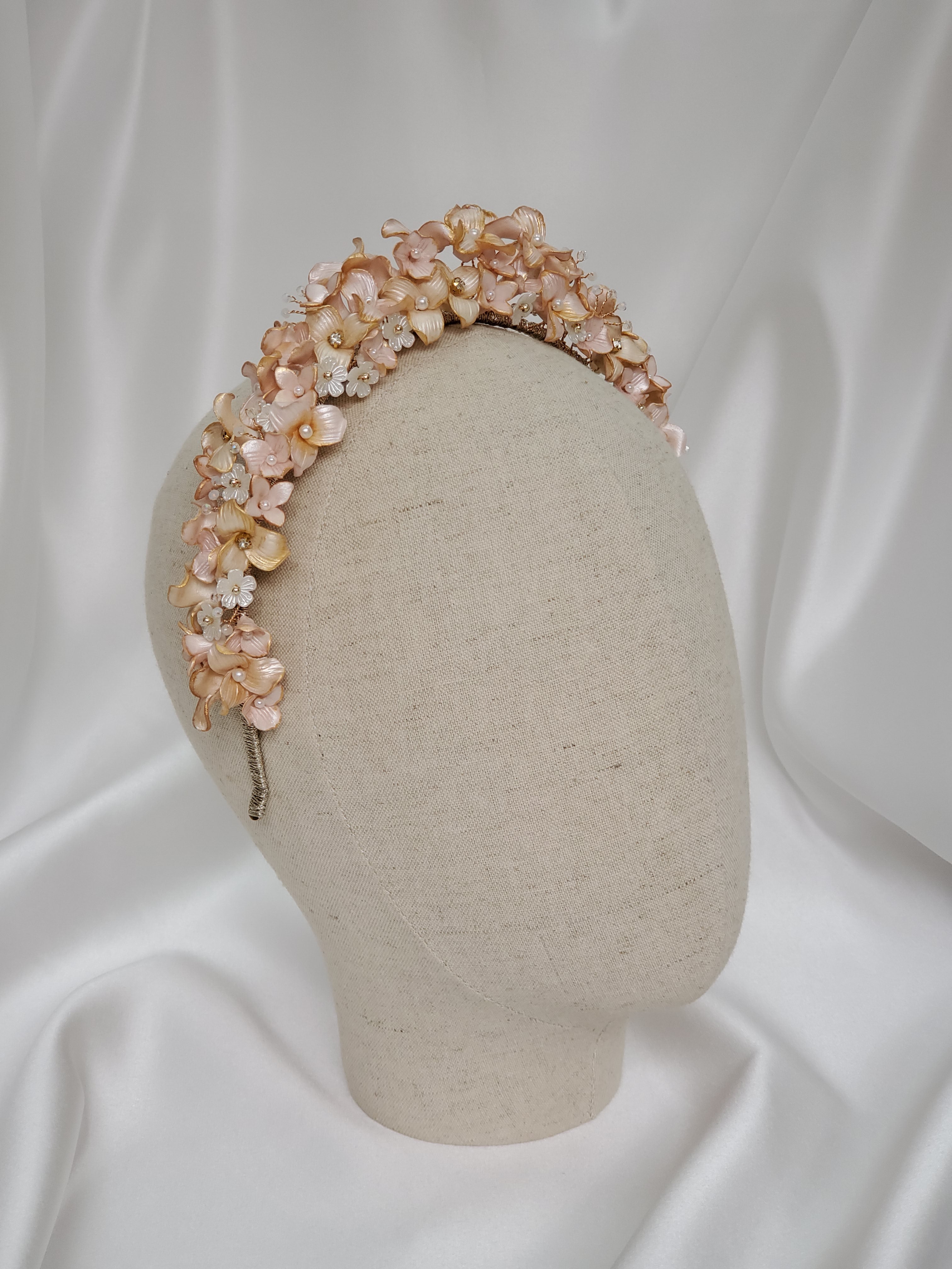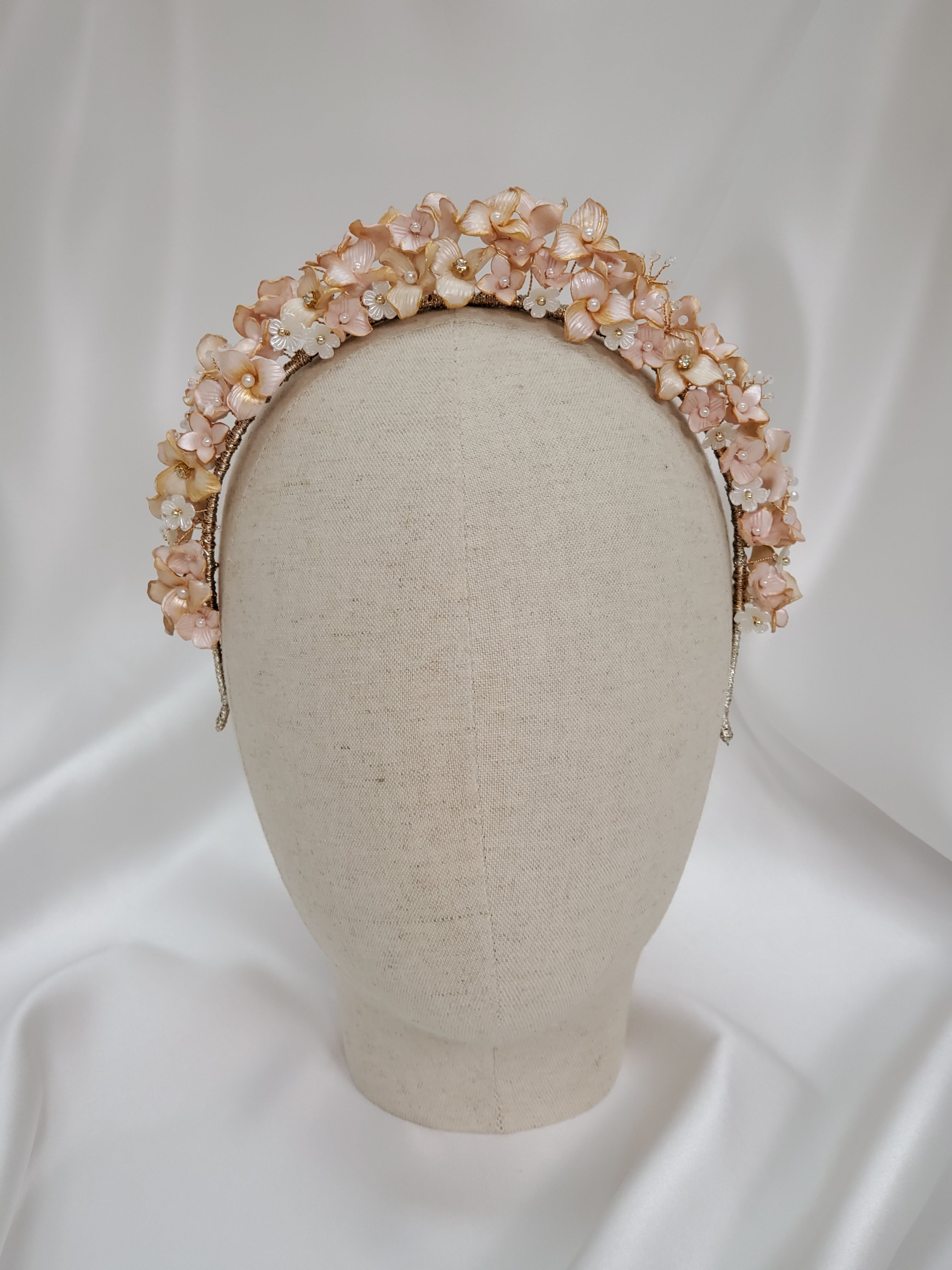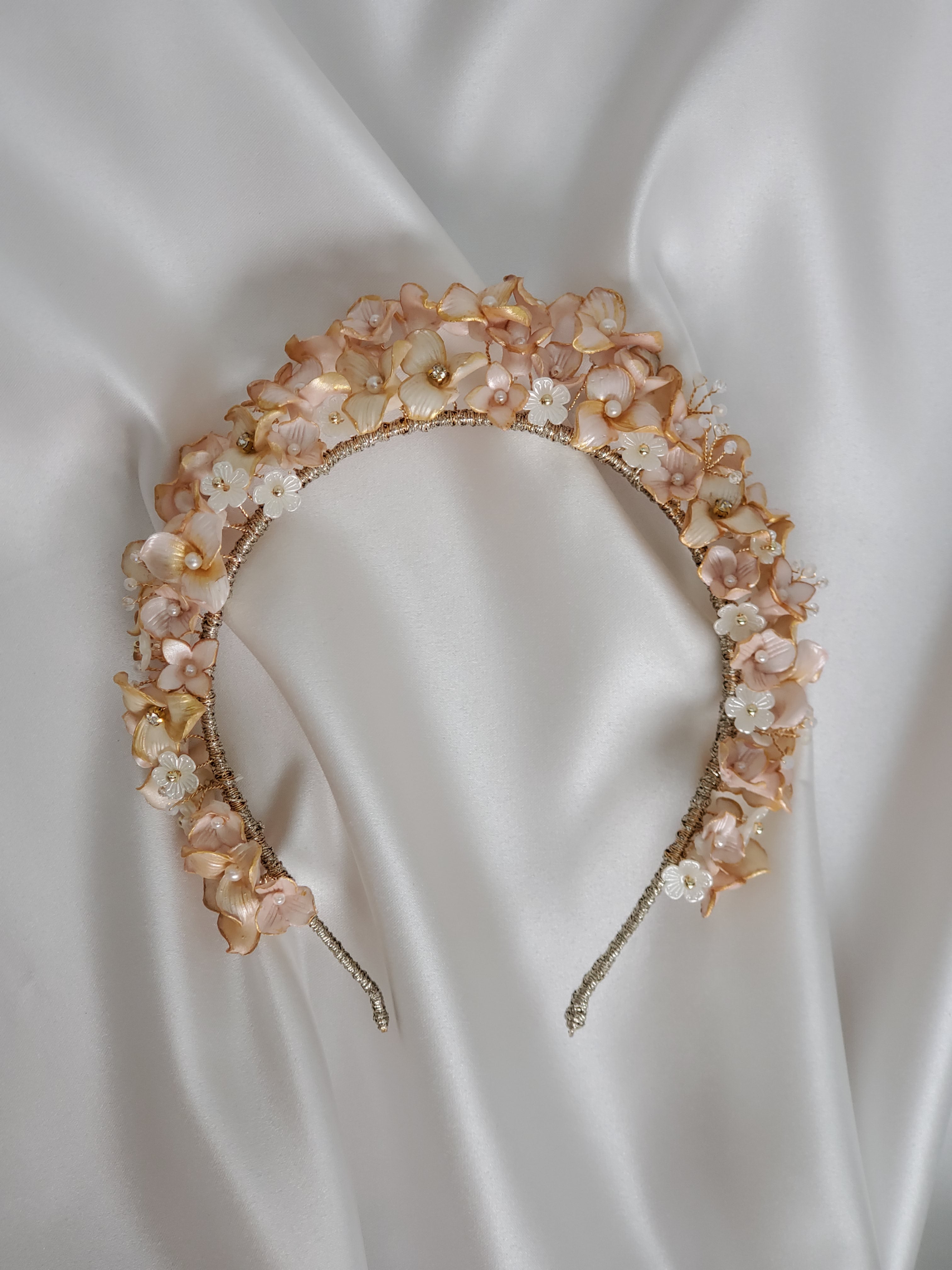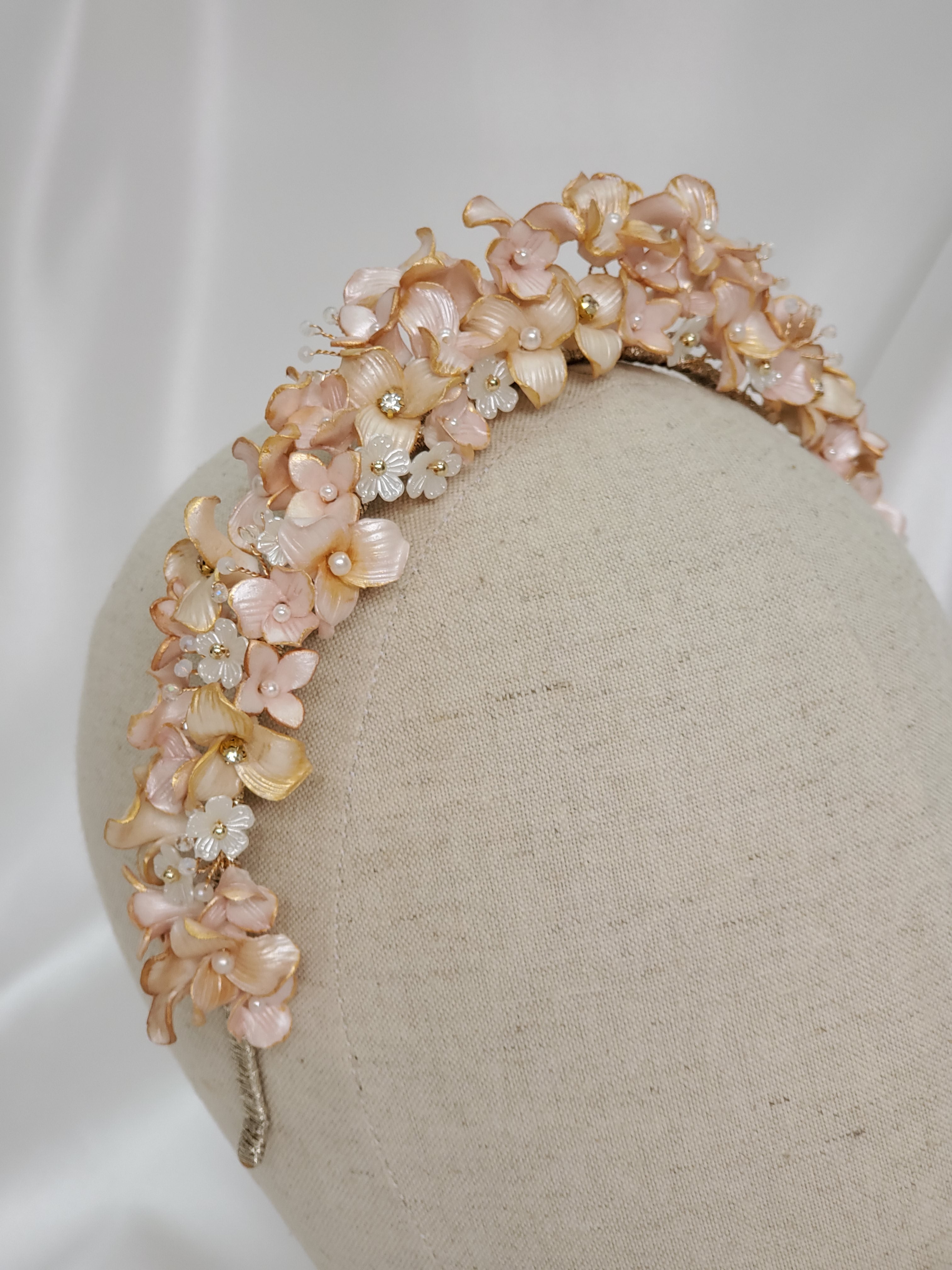 Elevate your style with a piece of wearable art. This luxurious headpiece showcases an abundance of over 60 handcrafted, lily-shaped clay flowers. The artisanal quality is evident in the unique detail of each petal, individually painted with a sheer, blushing iridescence and hand-finished with delicate strokes of gold. A constellation of ivory pearls, glimmering rhinestones, and radiant gold beads is interwoven into the design, creating a rich texture and breathtaking sparkle. This is more than just an accessory—it's a meticulously crafted piece designed to make a magnificent statement.